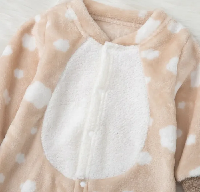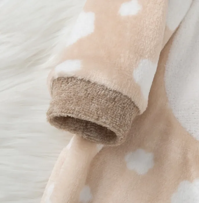 Keep your little one warm, cozy, and irresistibly cute with this Baby Plush Cloud Print Romper. Designed in a soothing neutral tone with an adorable cloud pattern and a soft contrast belly panel, this one-piece outfit is perfect for chilly days and snug nights.